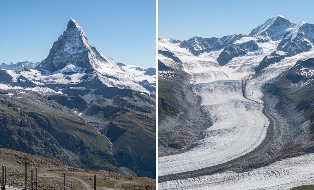 最初に行ったとき、私はただ“眺めるだけかな?”と思っていたんですが、実際に立ってみるとスケールが全然違いました。何も遮るものがなく、視界いっぱいに山、山、山。正面にはマッターホルン。横を見ると氷河の白い線が長く続いていて、「あ、自分いま本当にアルプスの上にいるんだな…」と実感した瞬間でした。