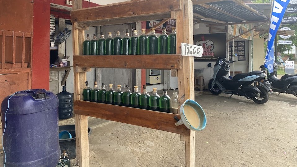 人瓶1リットル15,000ルピー。お店の人に何リットル入れてほしいか行ったら給油してくれます。普通のガソリンスタンドはひとつ見ましたが長蛇の列、ロンボクではこの給油方法が早くて便利。