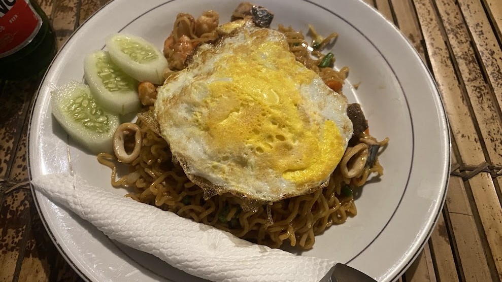 夕食はシーフードミゴレン。派手さはないけど、家庭的な味でほっと一息。