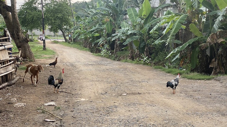 牛やヤギがのんびり歩き、鶏はそこら中をウロウロ。