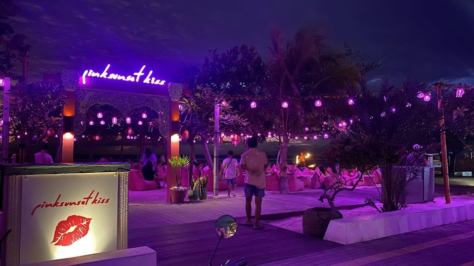 ビーチ沿いにはバーやレストラン、サーフスクールが並び、テクノミュージックが流れています。