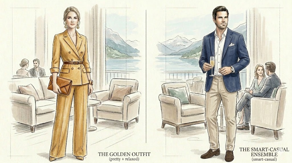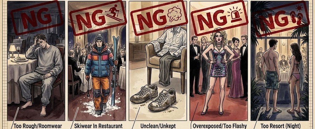 ドレスコードはやや厳しめで、夕食時にはジャケットやフォーマルに近い服装が求められることがあります。