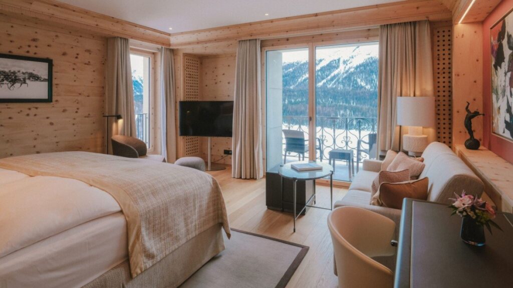 初めてサンモリッツに来るなら、ぜひ湖側の客室を選んでほしいと思います。朝カーテンを開けた瞬間に広がる湖と山の景色は、「ああ、ここに来たんだな」と実感できる瞬間です。